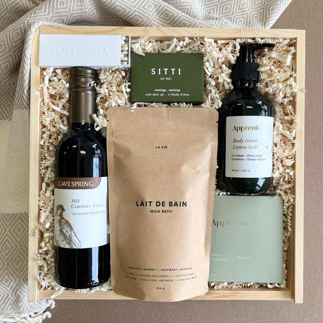 A calming, elevated gift designed to bring a little everyday luxury to their quiet moments. The Garden features a thoughtfully curated mix of premium Canadian-made goods with a focus on soothing self-care essentials along with a wonderful Ontario Cabernet Franc, all presented in our locally handmade wooden keepsake box for a gift that feels both refined and intentional. A great gift choice for a birthday, client or just because!